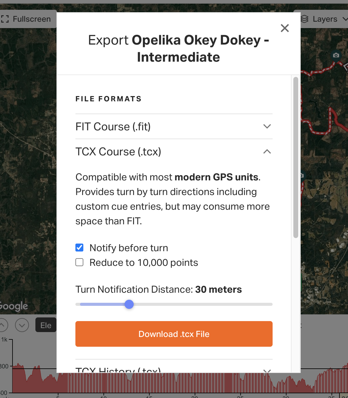 It will automatically be on the .fit option, so you'll have to select the next option down which is 'TCX Course', from here you can download the file and adjust when you'd like your turn notifications. It will automatically be set at 30 meters, personally I like to crank that up to 50, but that's just me.