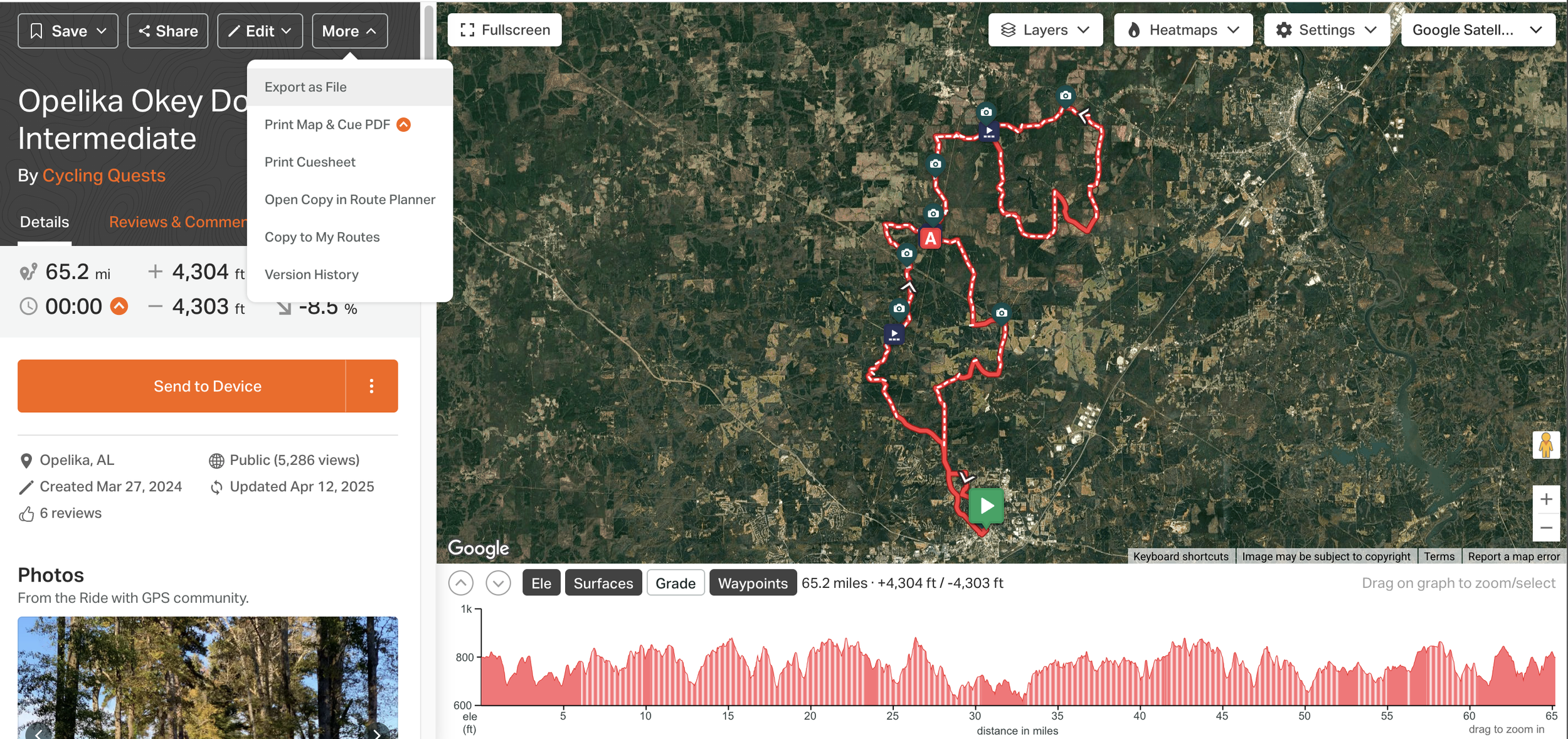 To find the TCX file, go to the Opelika Web Page and click on the distance you plan to ride, you will be redirected to the RideWithGPS page for that route.